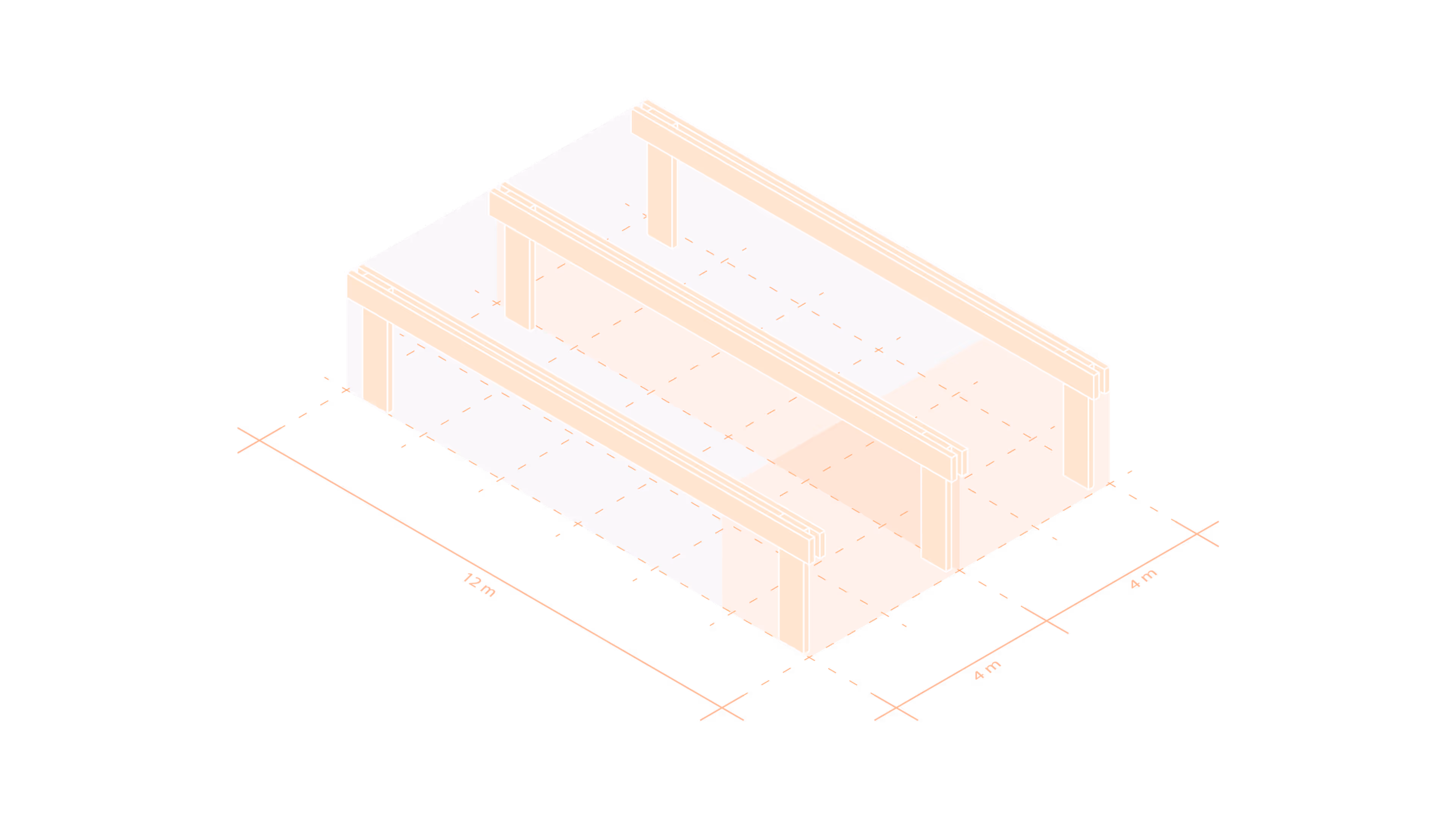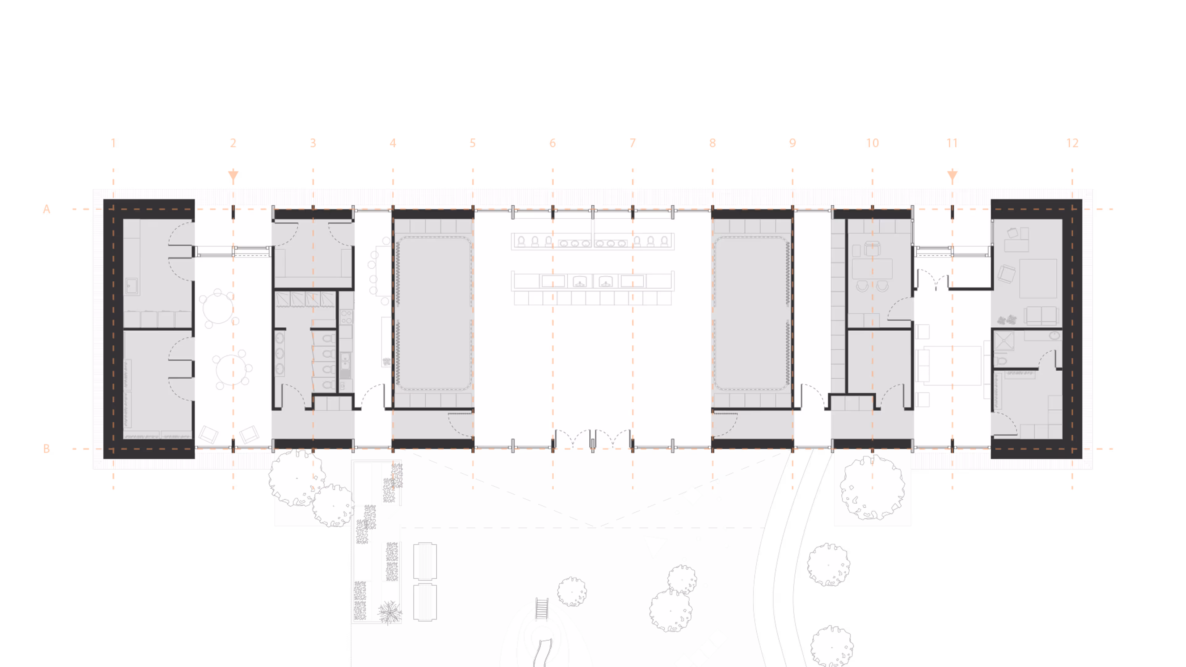 Versatile structural “arches,” formed by parallel beams and columns, adapt to various needs. Each arch can be opened, closed, made opaque, or transparent, ensuring simplicity and adaptability throughout the design.